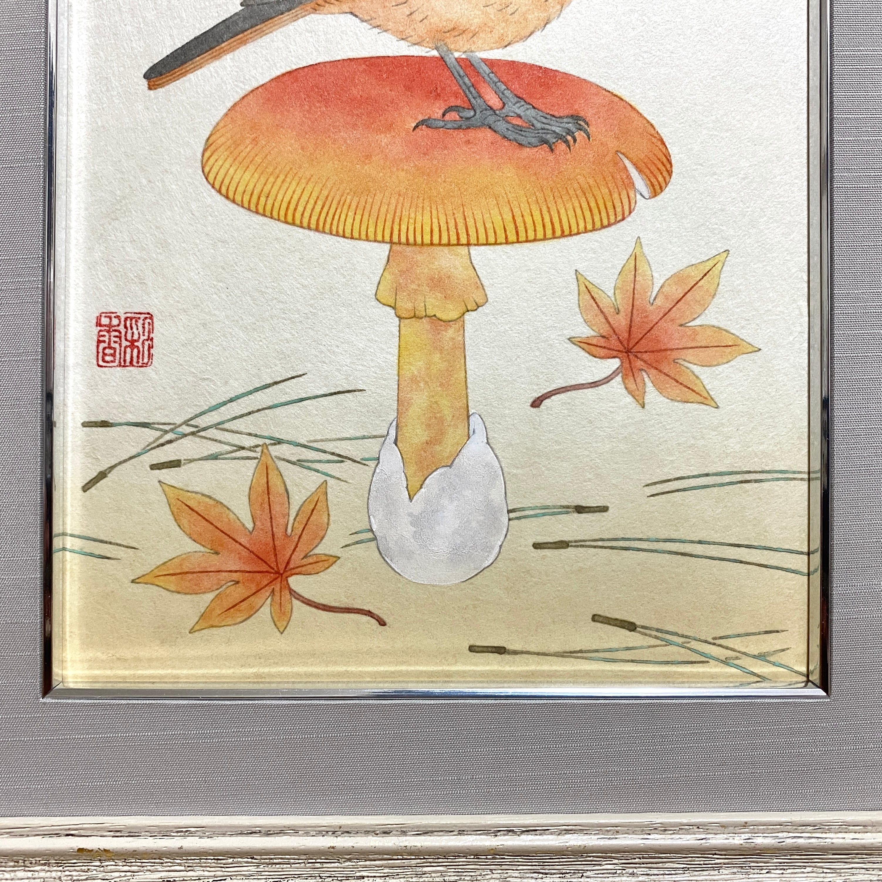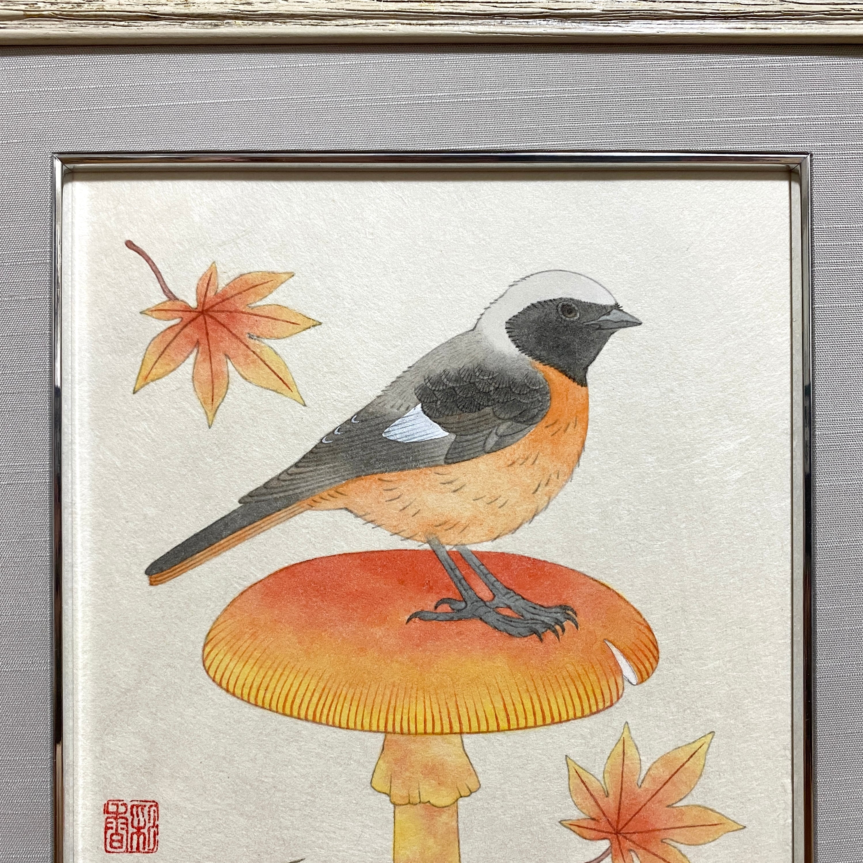 和紙に墨と岩絵具などの日本画材料で尉鶲(ジョウビタキ)とベニテングタケ、紅葉や松の葉を描いた絵です。